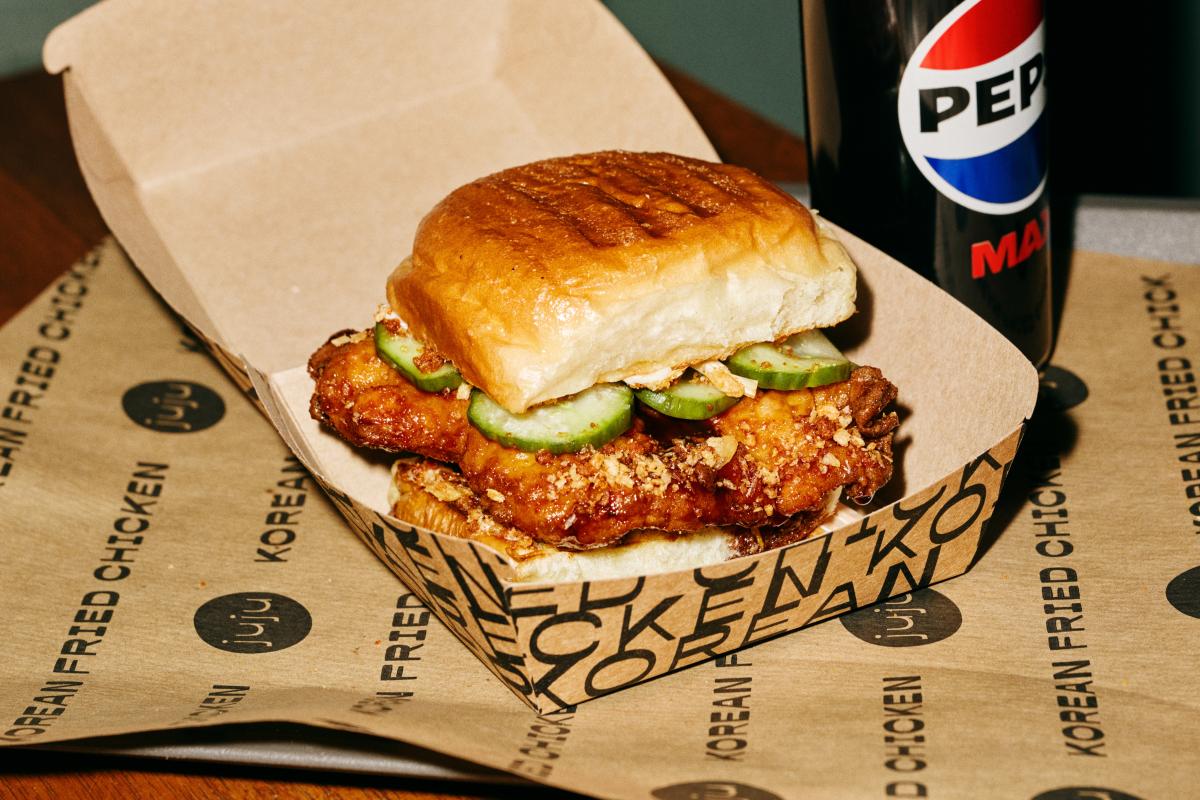 Korean fried chicken sandwich med sprød hvidløg og honning-soya glaze.